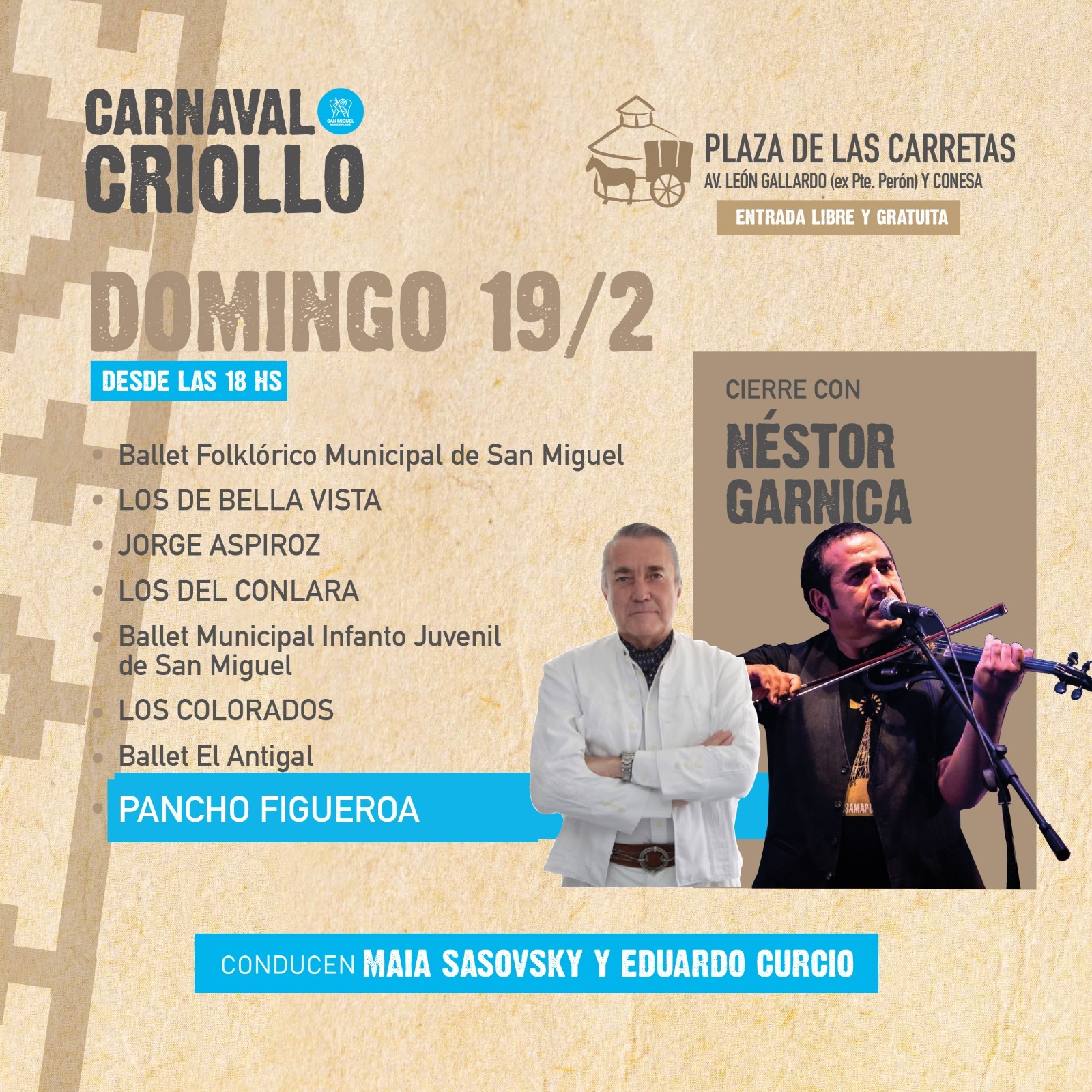 Mientras que el domingo 19 se presentarán Néstor Garnica, Pancho Figueroa, Los Colorados, Los del Conlara, el Ballet Folklórico Municipal Infanto Juvenil de San Miguel, Los de Bella Vista, Jorge Aspiroz y el Ballet Antigal.