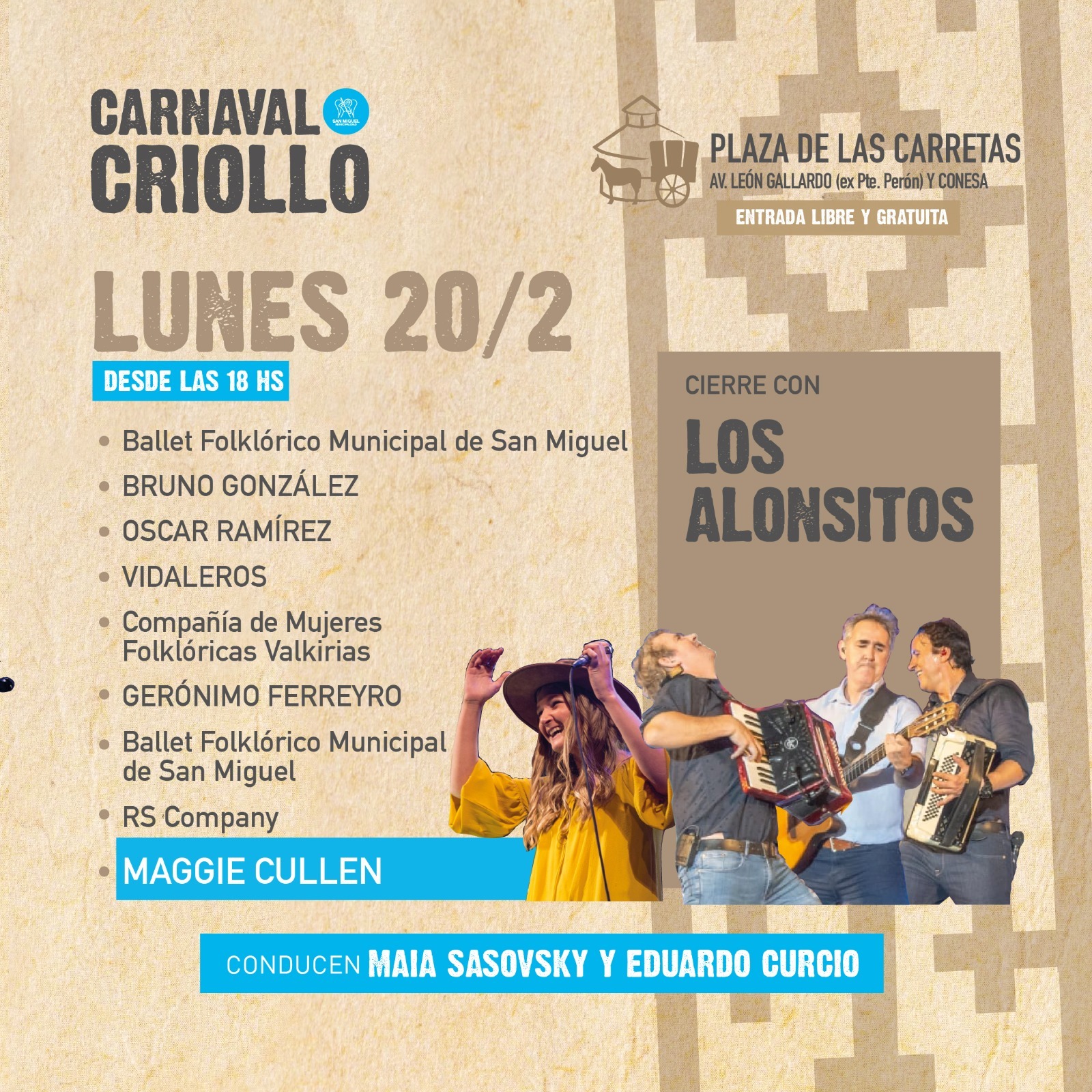 El gran cierre del lunes 20 estará a cargo de Los Alonsitos y este día participarán también Maggie Cullen, Gerónimo Ferreyro, Compañía de Mujeres Folklóricas Valquirias, RS Company de Maro Oliva, Vidaleros, Bruno González y los tres elencos del Ballet Folklórico Municipal de San Miguel.