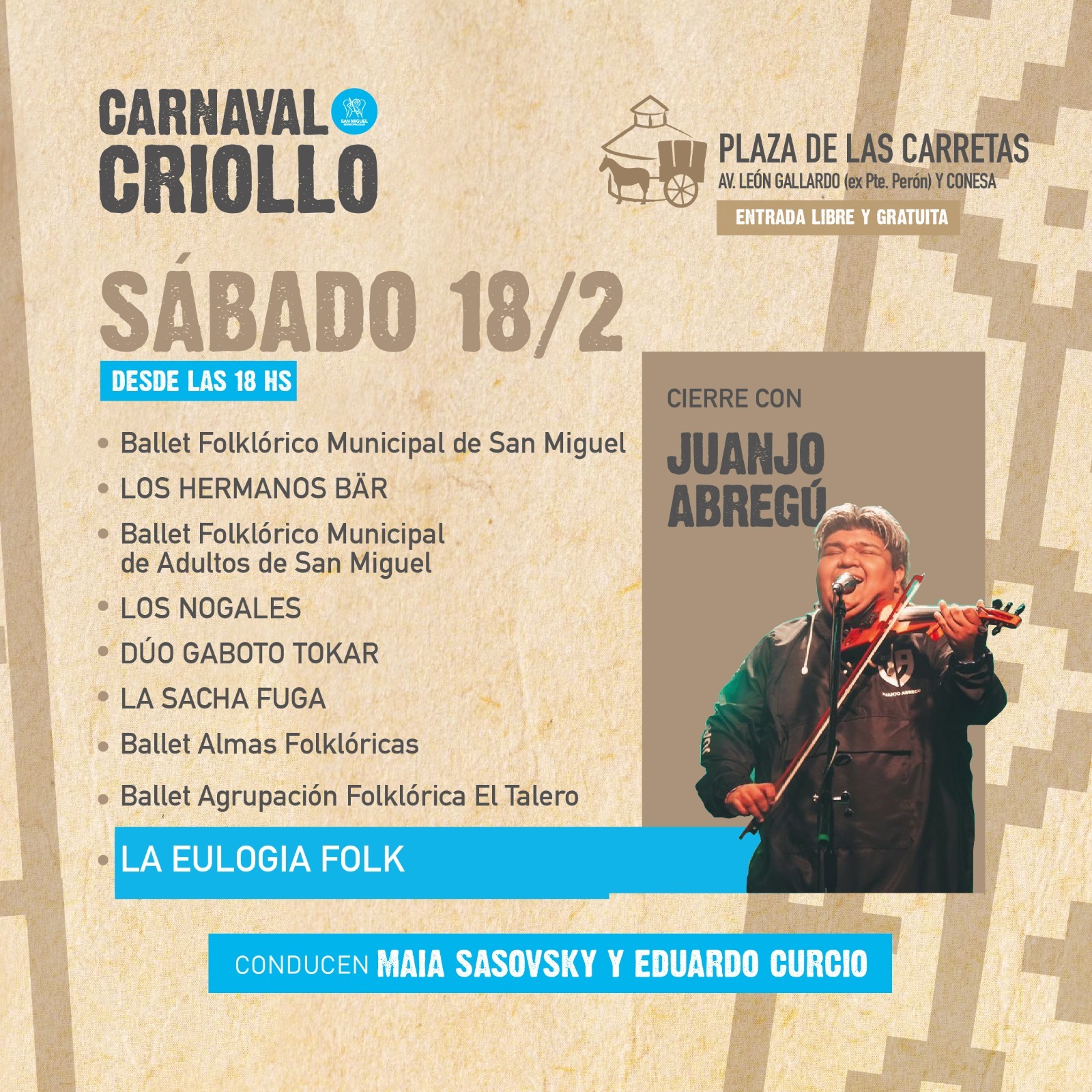 La segunda noche, el sábado 18, contará con la presencia de Juanjo Abregú, La Eulogia Folk, Los Nogales, el Ballet Almas Folclóricas, La Sacha Fuga, Los Hermanos Bar, el Ballet Folklórico Municipal de San Miguel, el Dúo Gaboto Tokar y el Ballet Agrupación Folclórica El Talero.