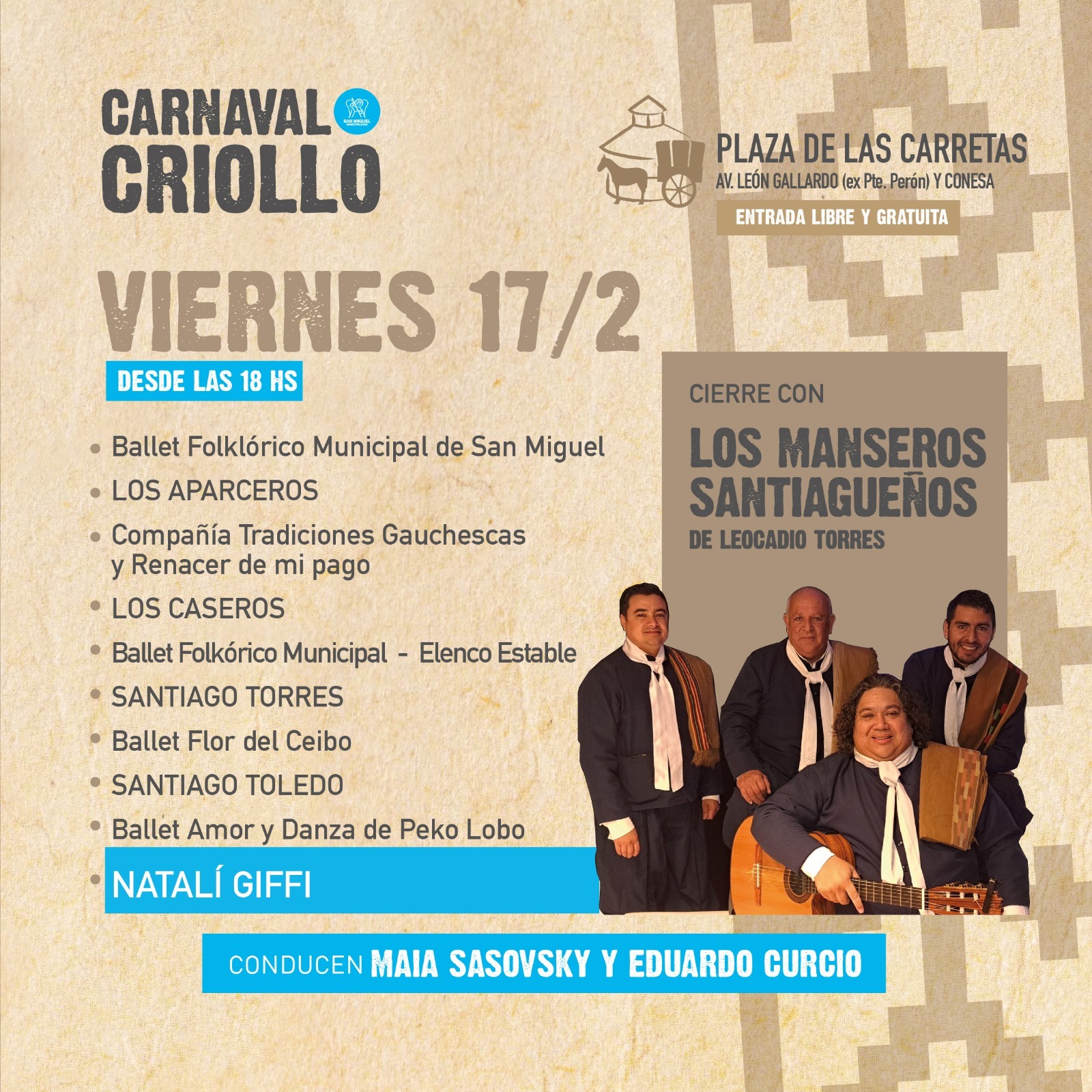 El viernes 17 estarán Natali Giffi, los Manseros Santiagueños de Leocadio Torres, el Ballet Folklórico Municipal de San Miguel, Luma Dúo, Los Aparceros, Los Caseros, Santiago Torres, Compañía Tradiciones Gauchescas y Renacer de mi Pago, el Ballet Amor y Danza de Peko Lobo y Santiago Toledo.
