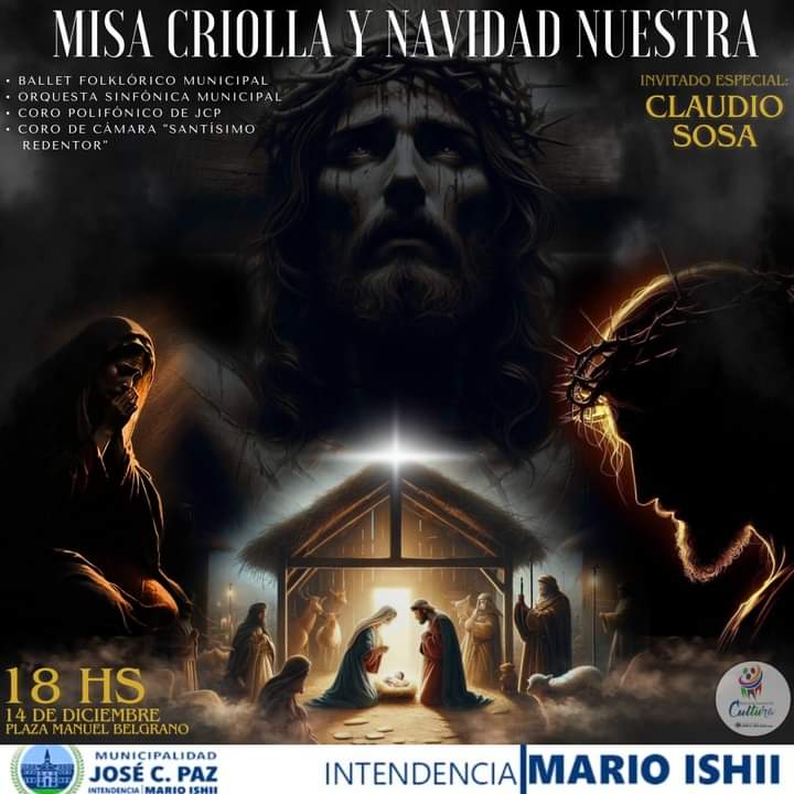 El Sábado 14/12 a las 18 HS en la Plaza Manuel Belgrano ( Frente a la capilla San José Obrero) se presentará la obra ” MISA CRIOLLA Y NAVIDAD NUESTRA’  con más de 100 artistas en escena.